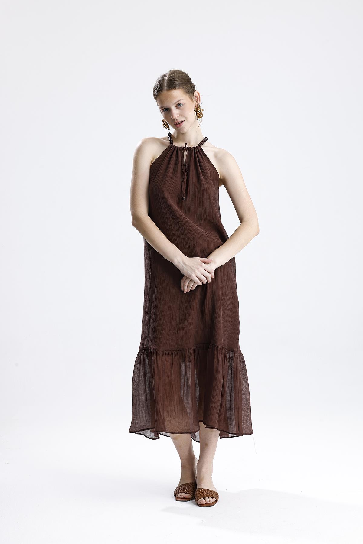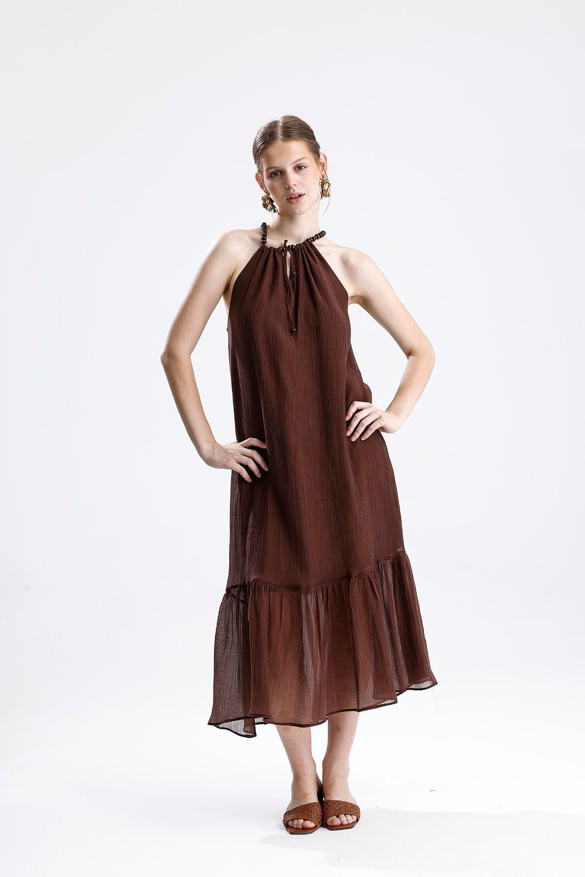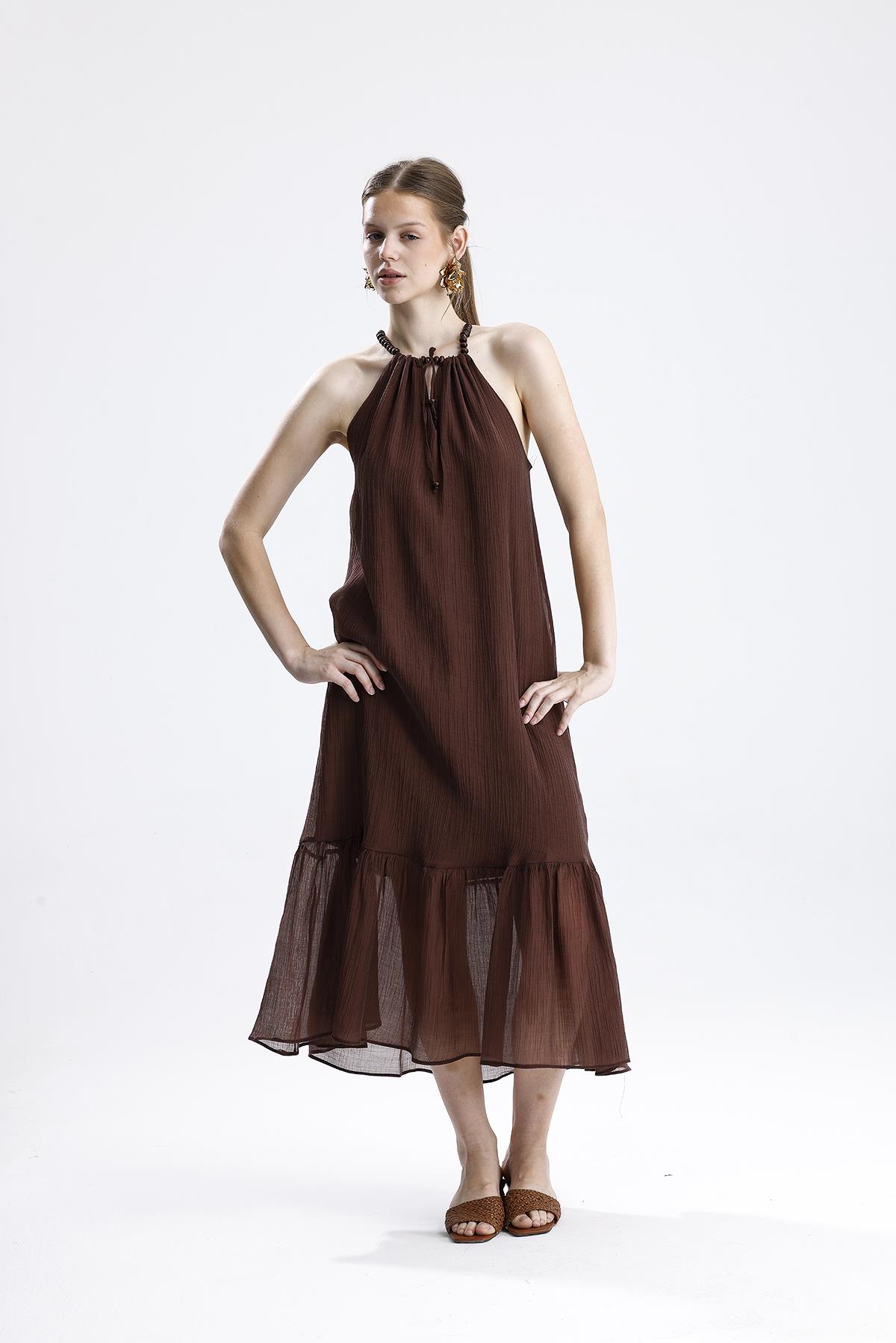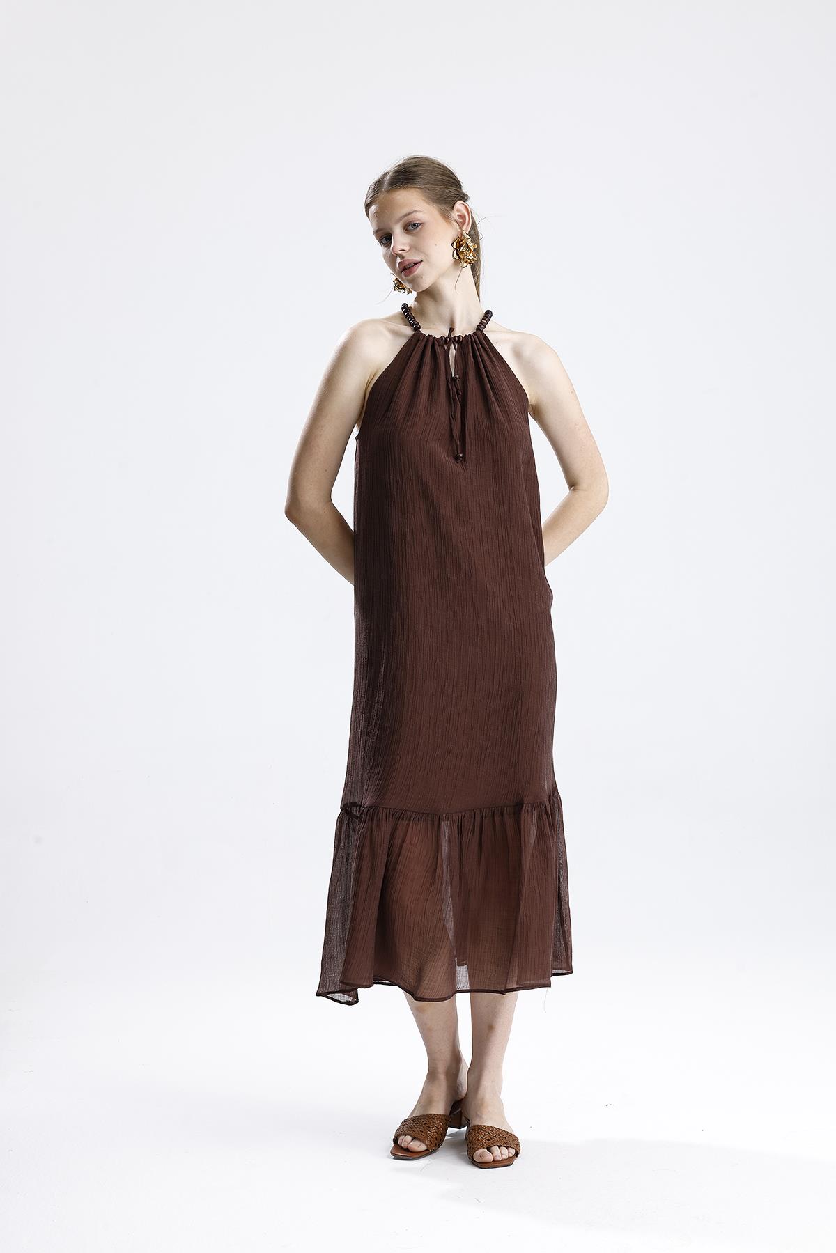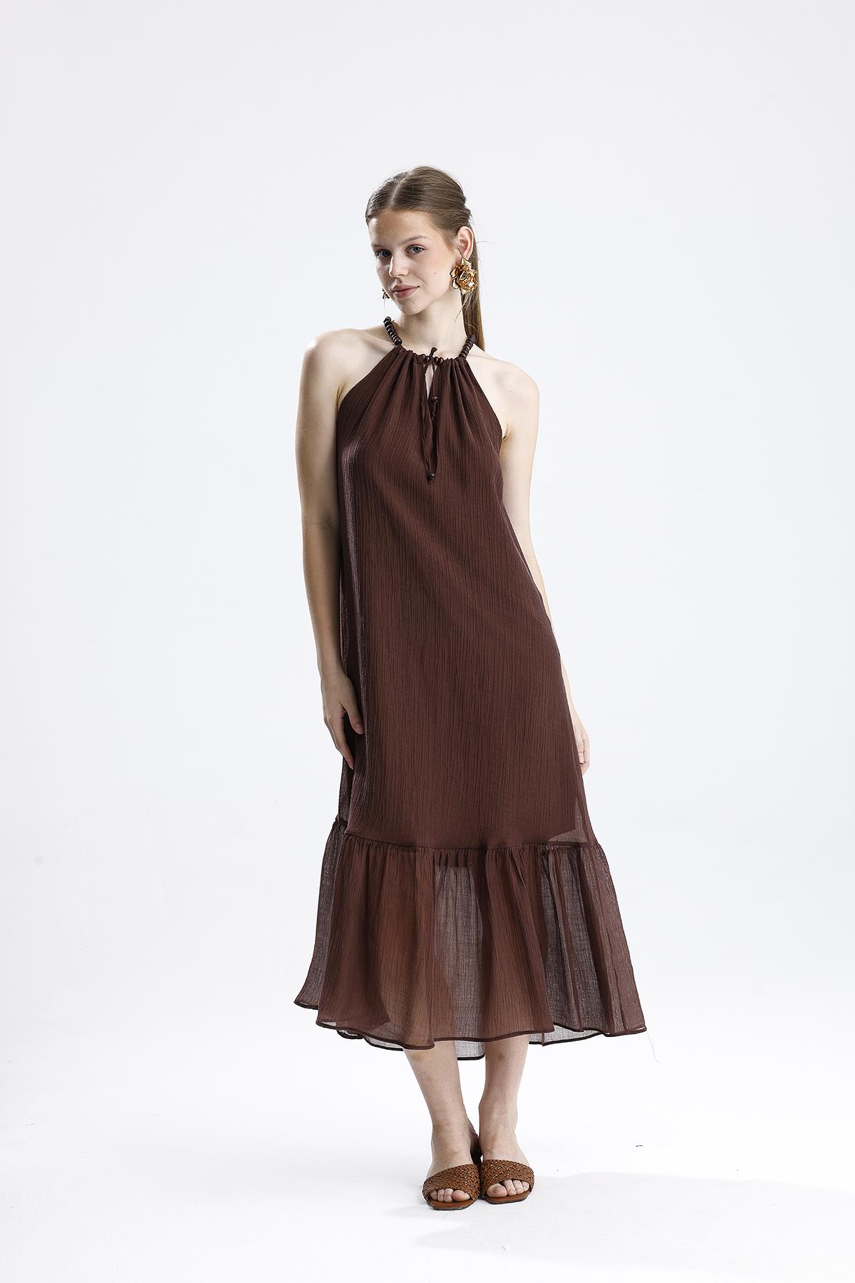 Askılı Boncuklu Kolsuz Elbise – Kahve
