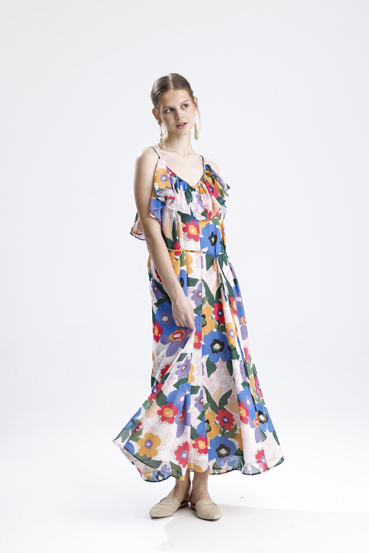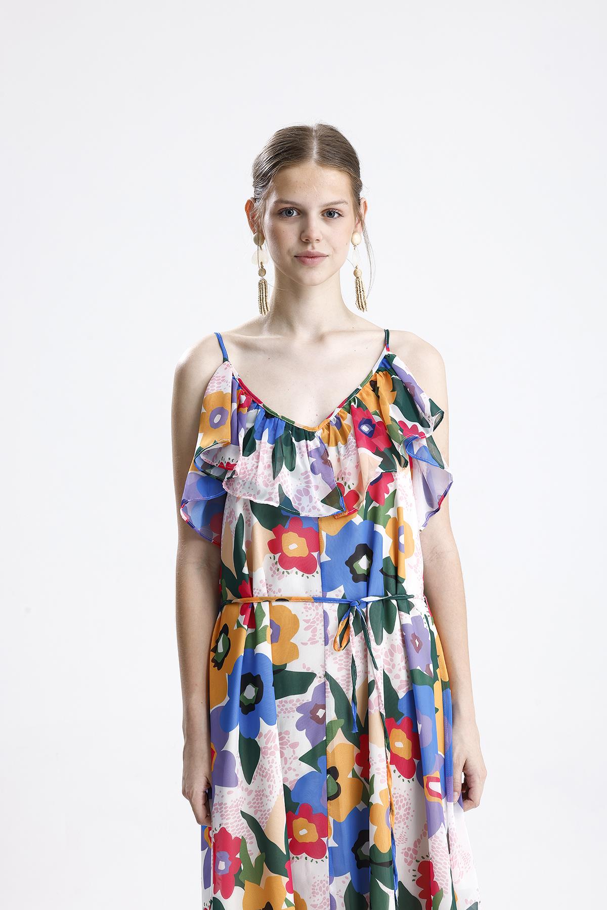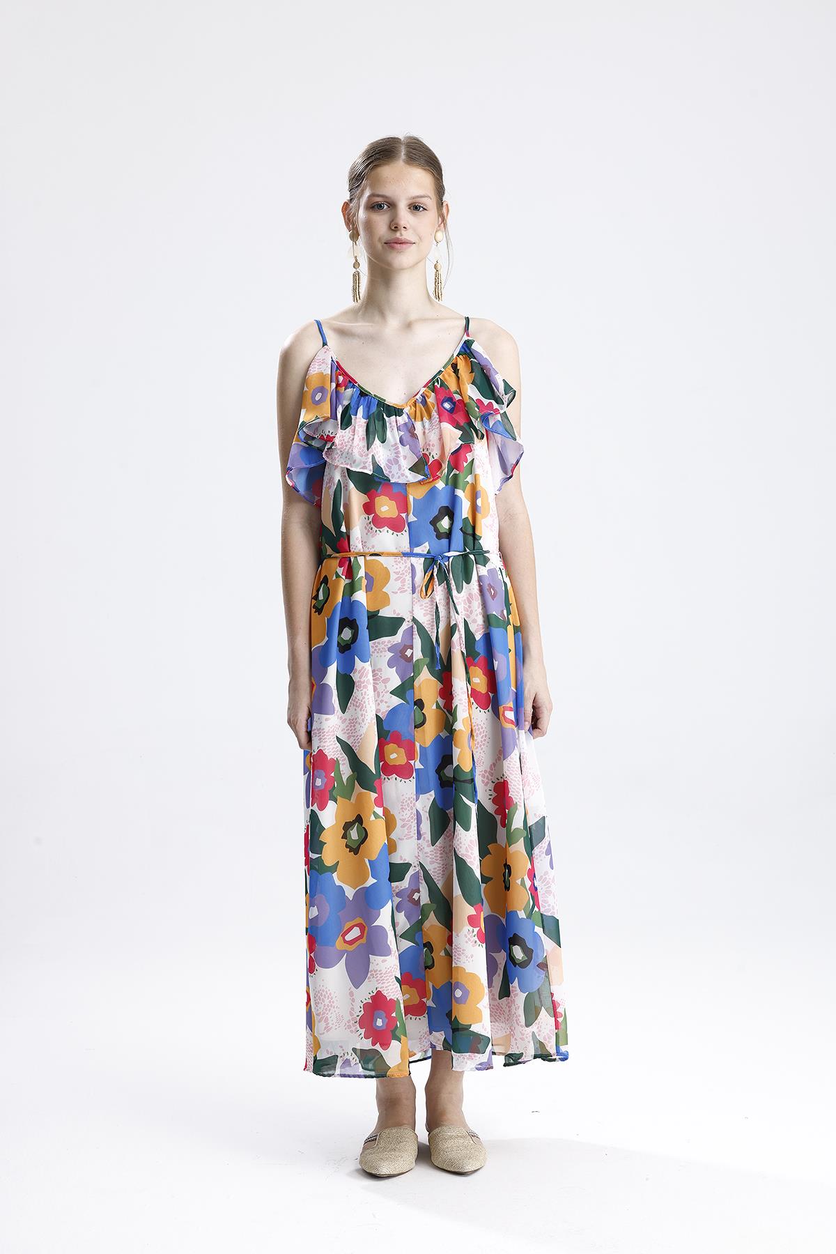Fırfır Detaylı Çiçek Desenli Şifon Elbise – Sarı