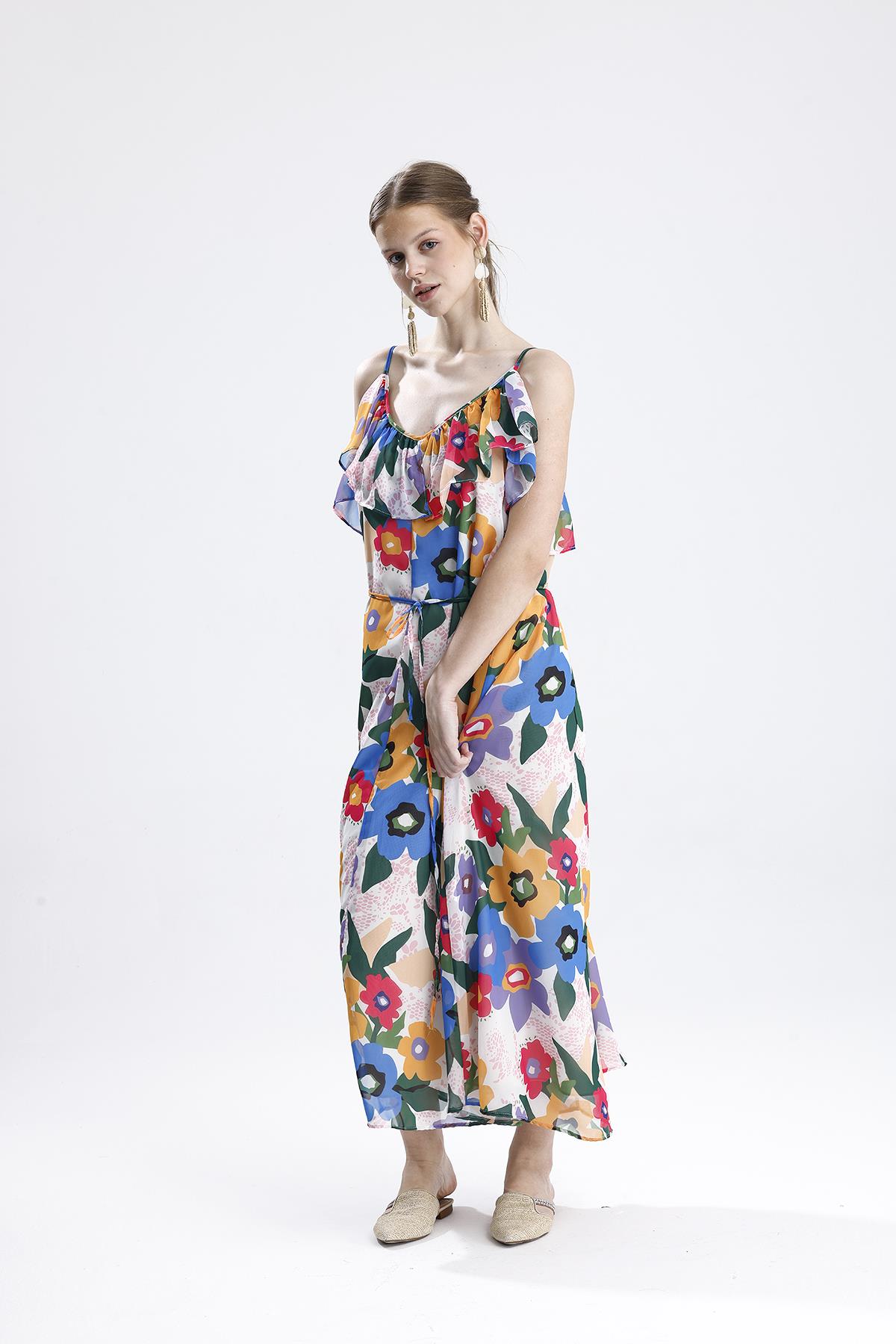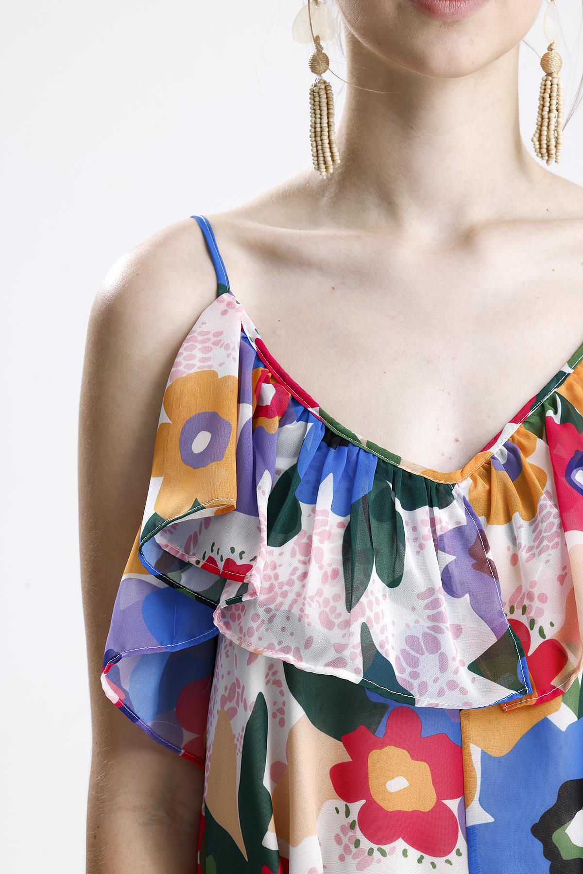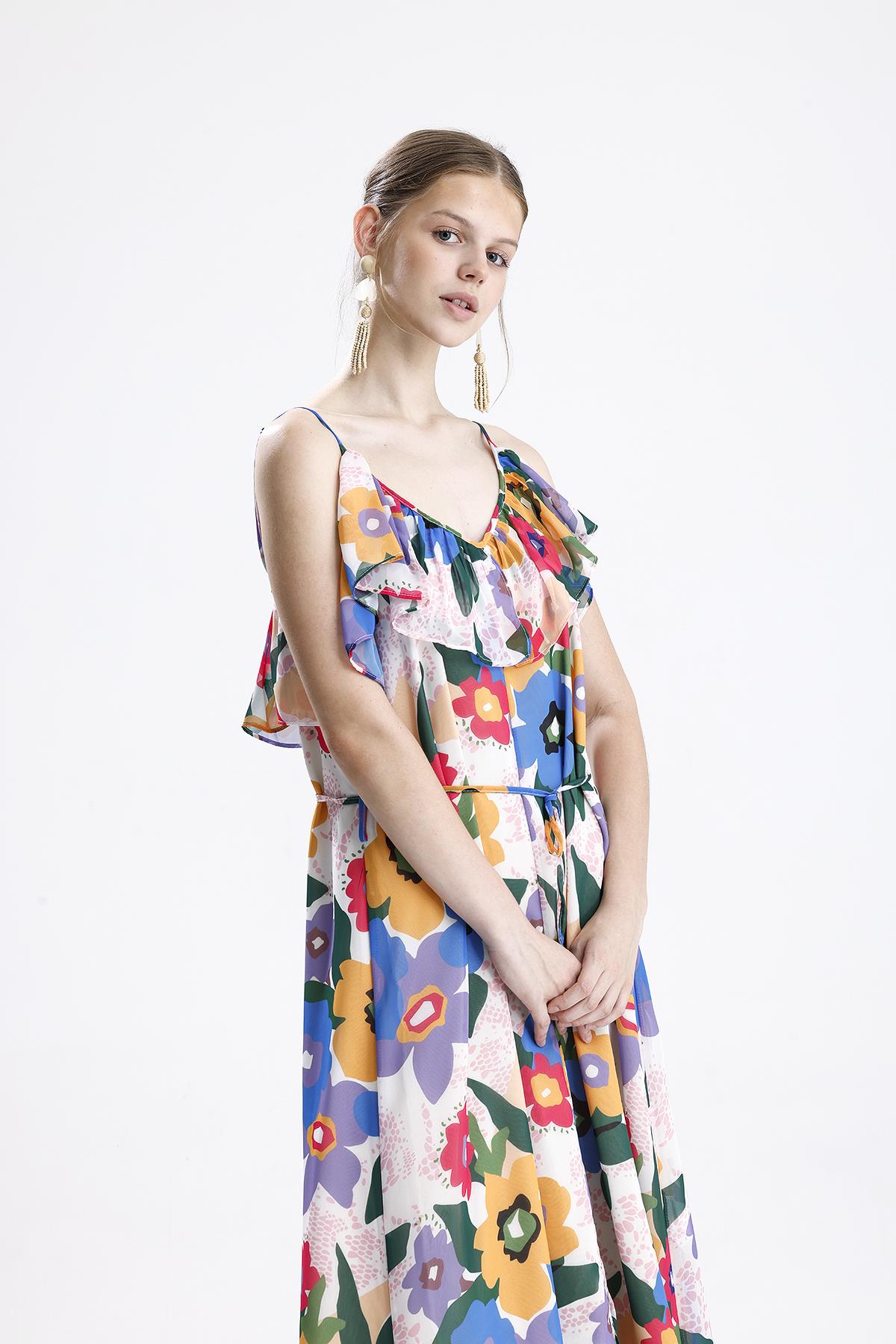 Fırfır Detaylı Çiçek Desenli Şifon Elbise – Sarı