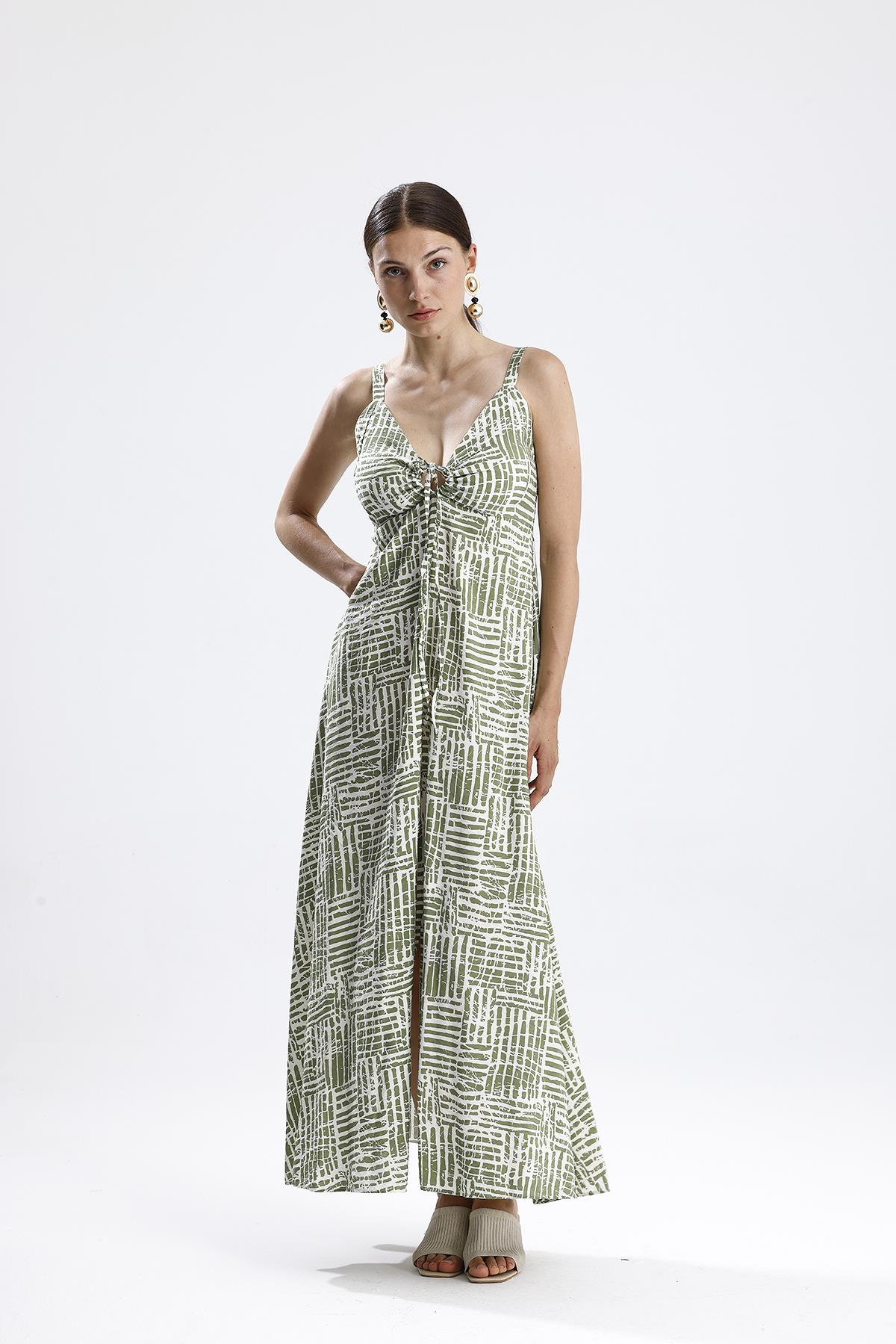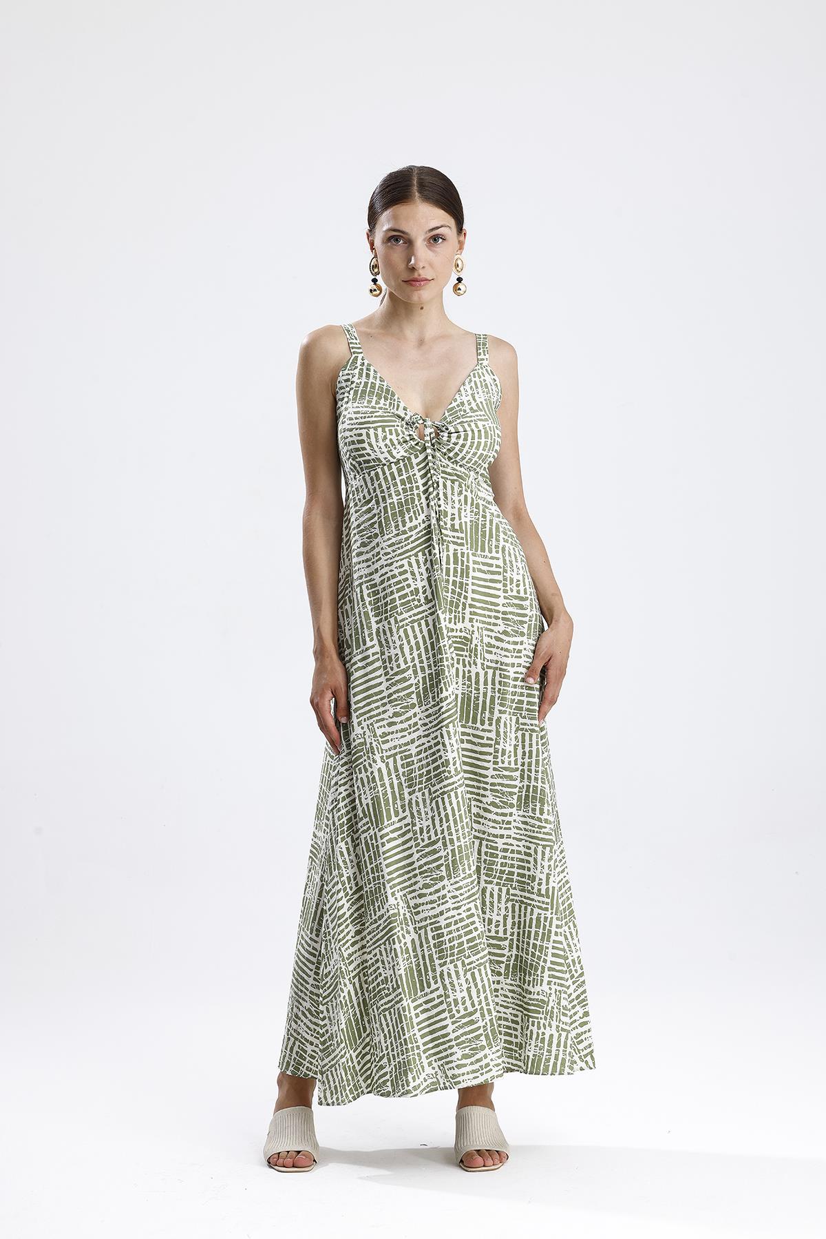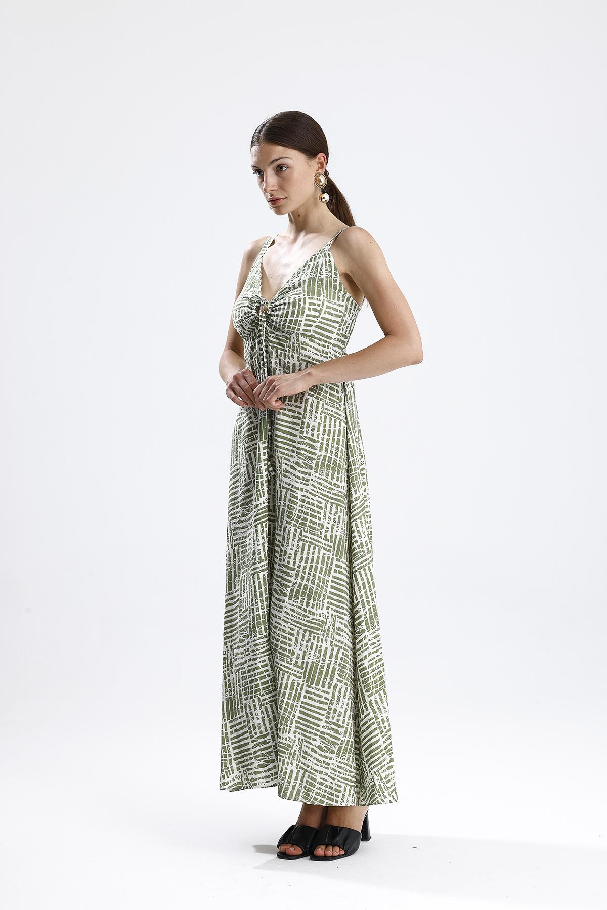Gloplu Gipeli Askılı Desenli Elbise – Yeşil
