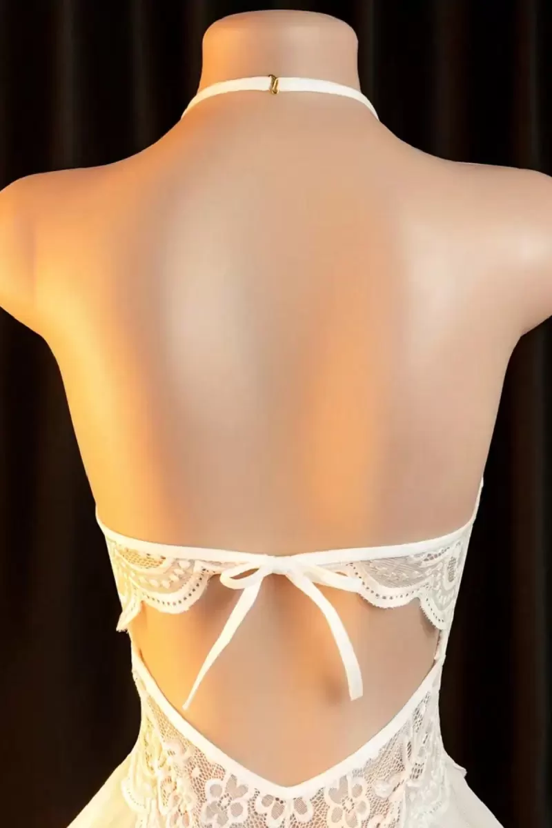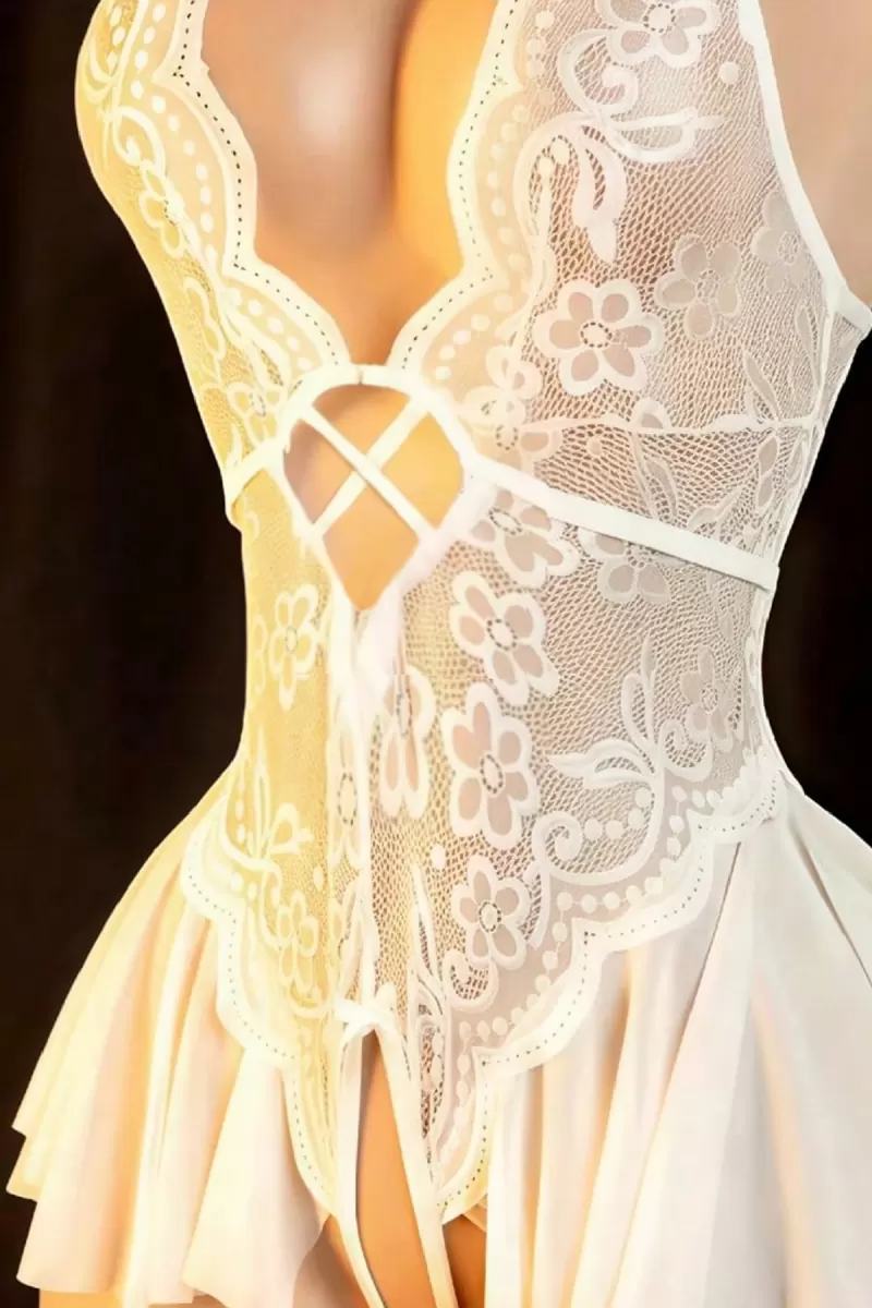 Kadın Beyaz Dantel ve Tül Detaylı Derin V Yaka Teddy Gecelik