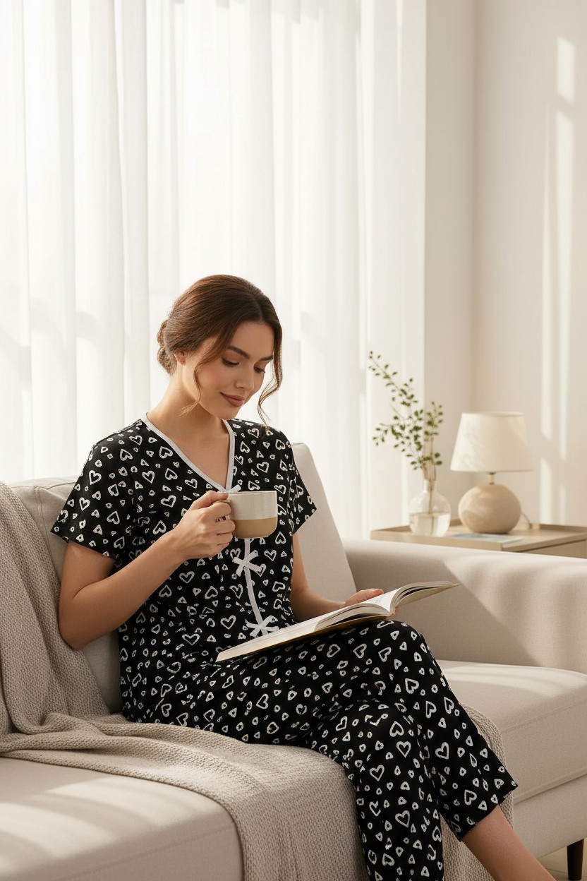 Kadın Siyah Beyaz Kalp Desenli Fiyonklu Kısa Kollu Pijama Takımı – Rahat, Şık ve 4 Mevsim Kullanım