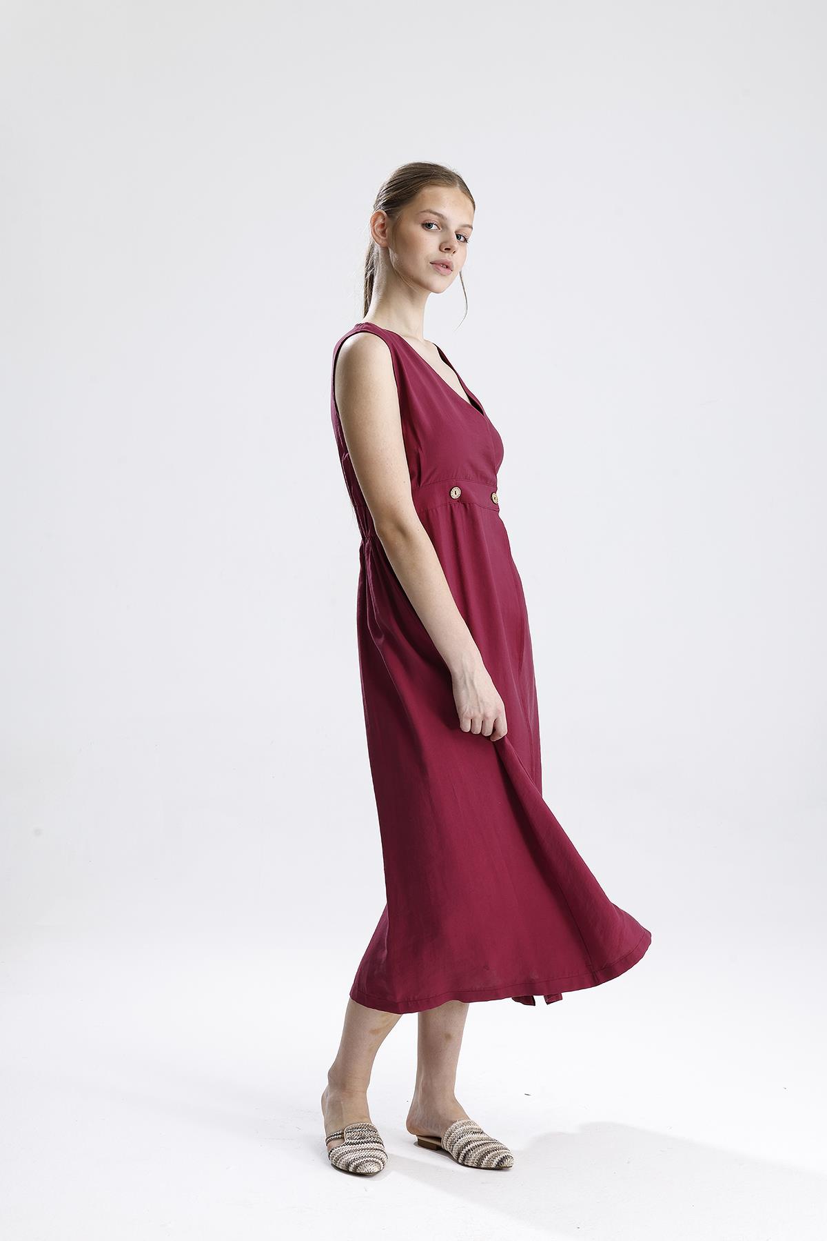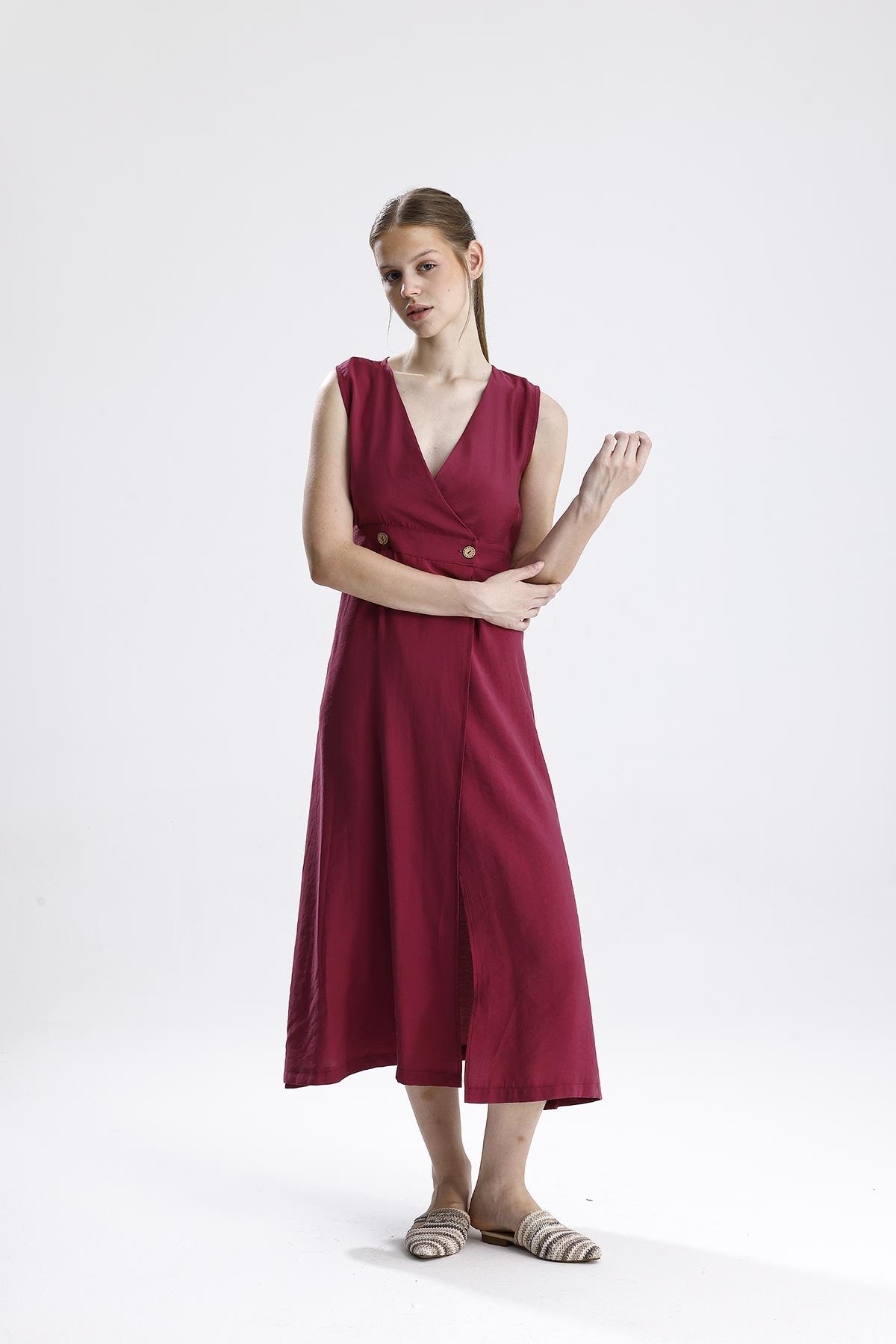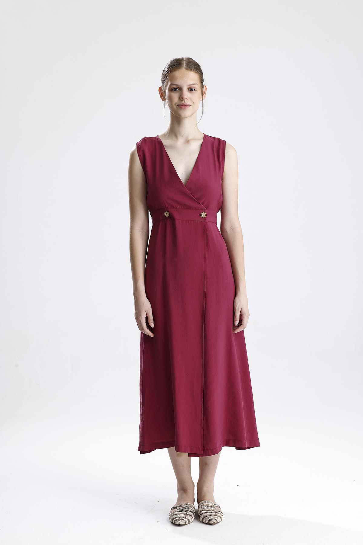 Kruvaze Pileli Bordo Elbise – Bordo