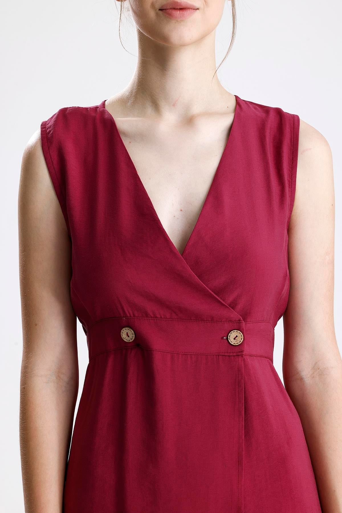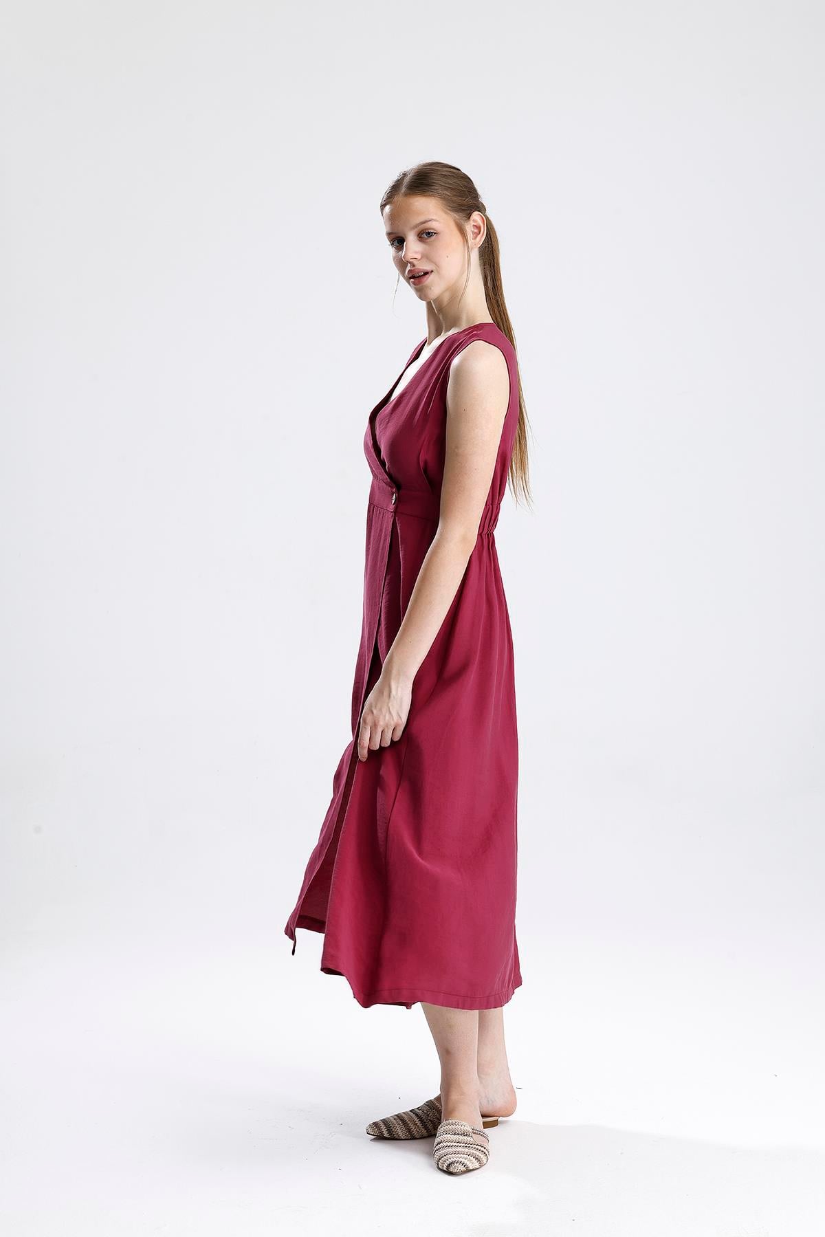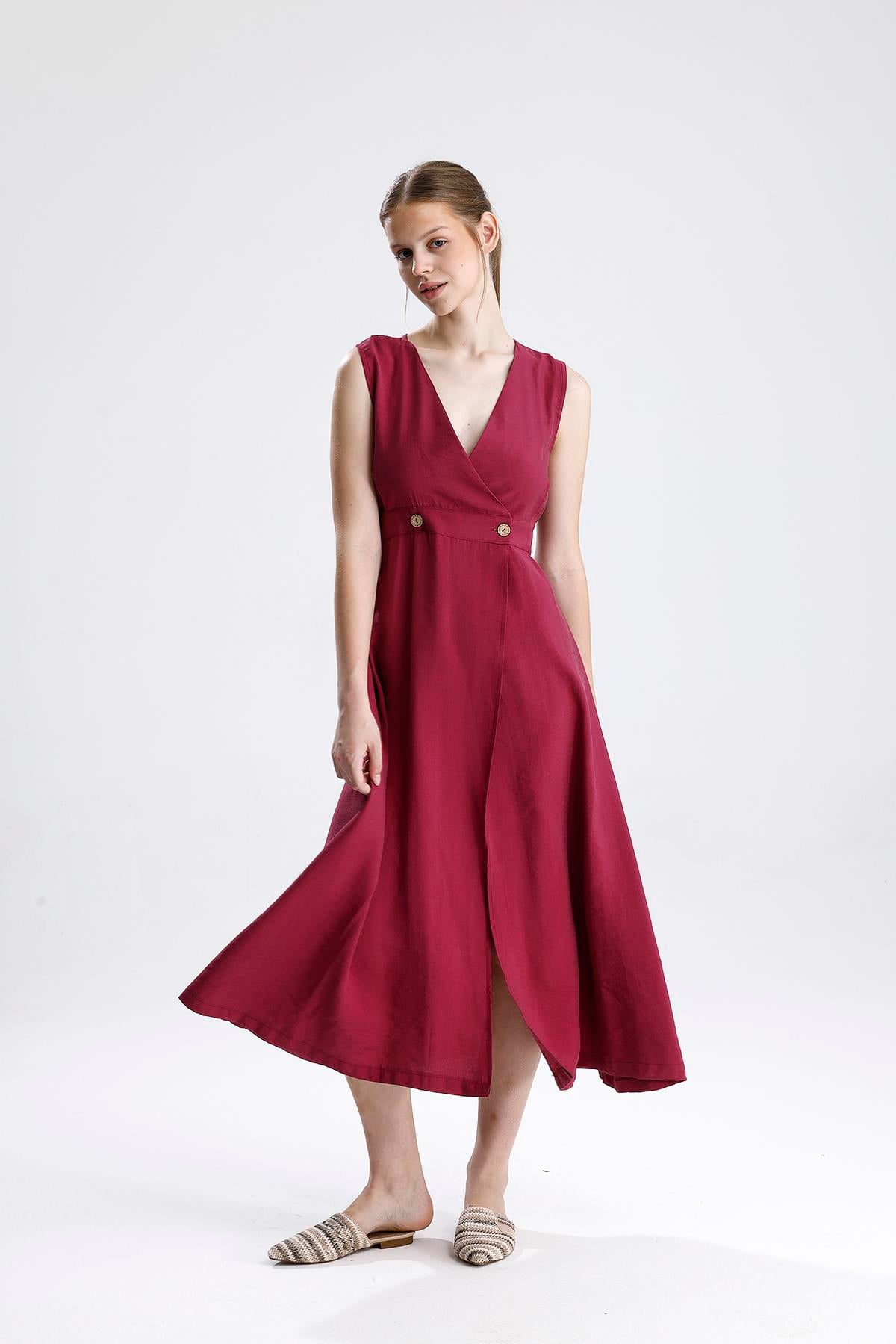 Kruvaze Pileli Bordo Elbise – Bordo