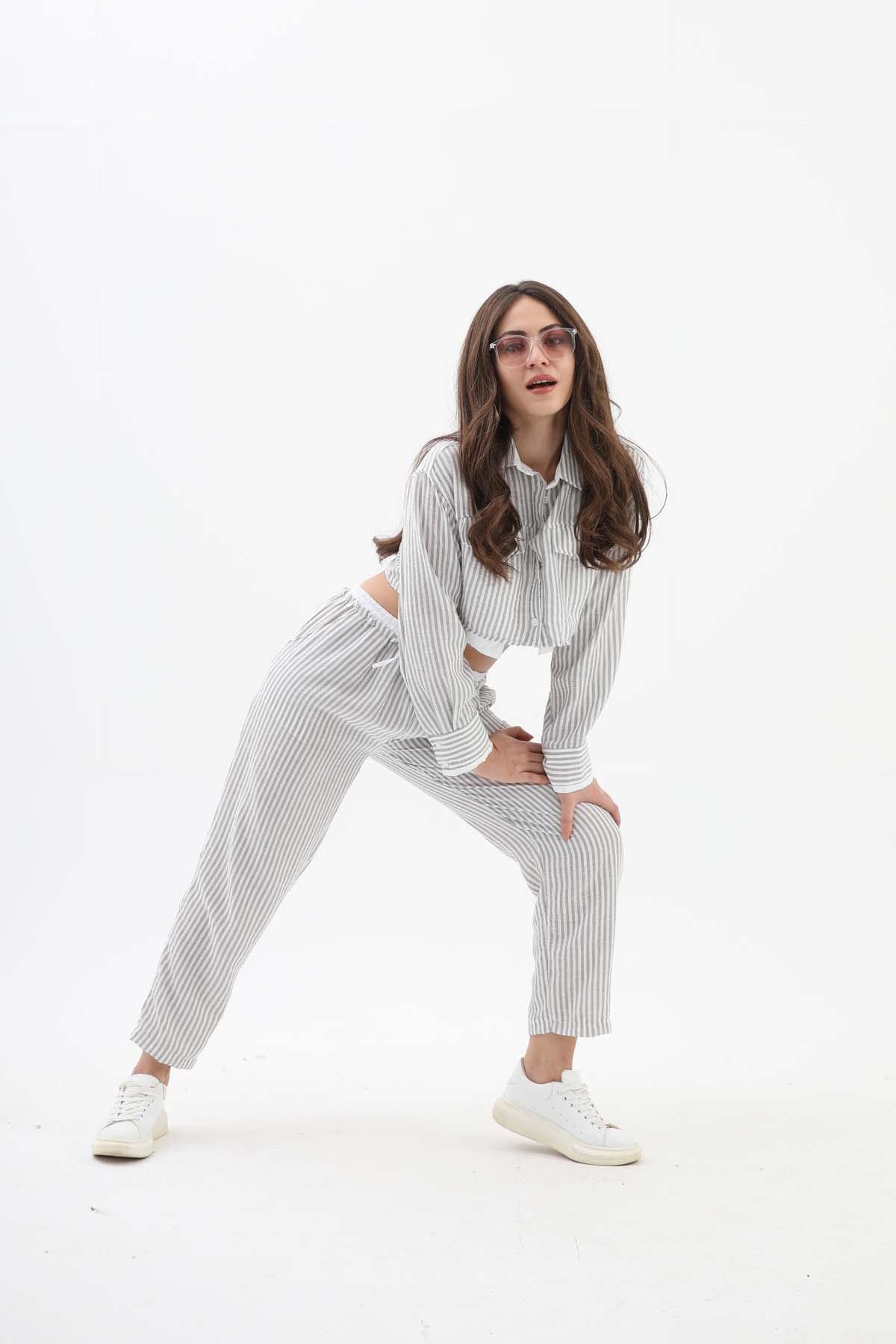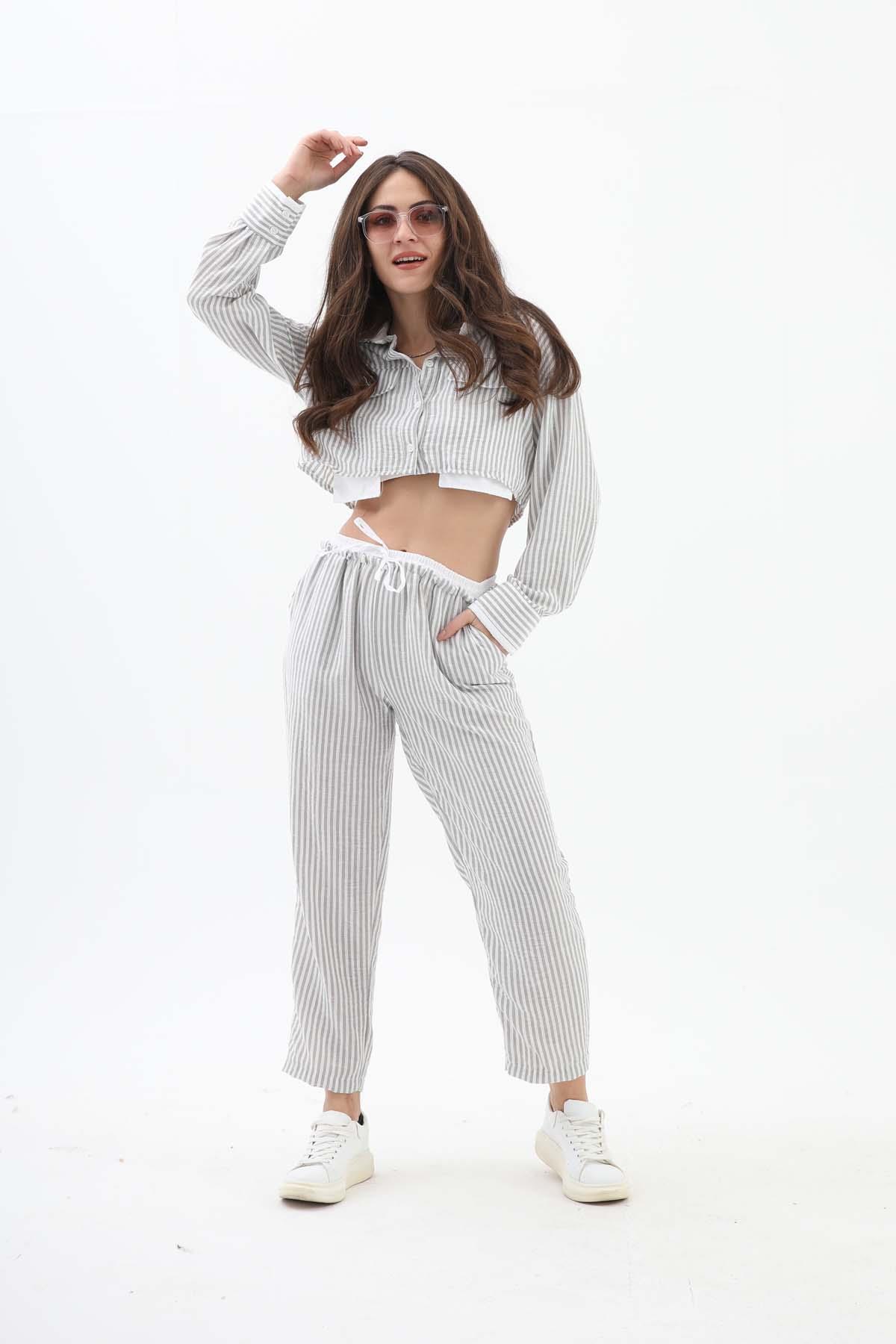 Poplin Garnili Çizgili Croplu İkili Takım – Gri